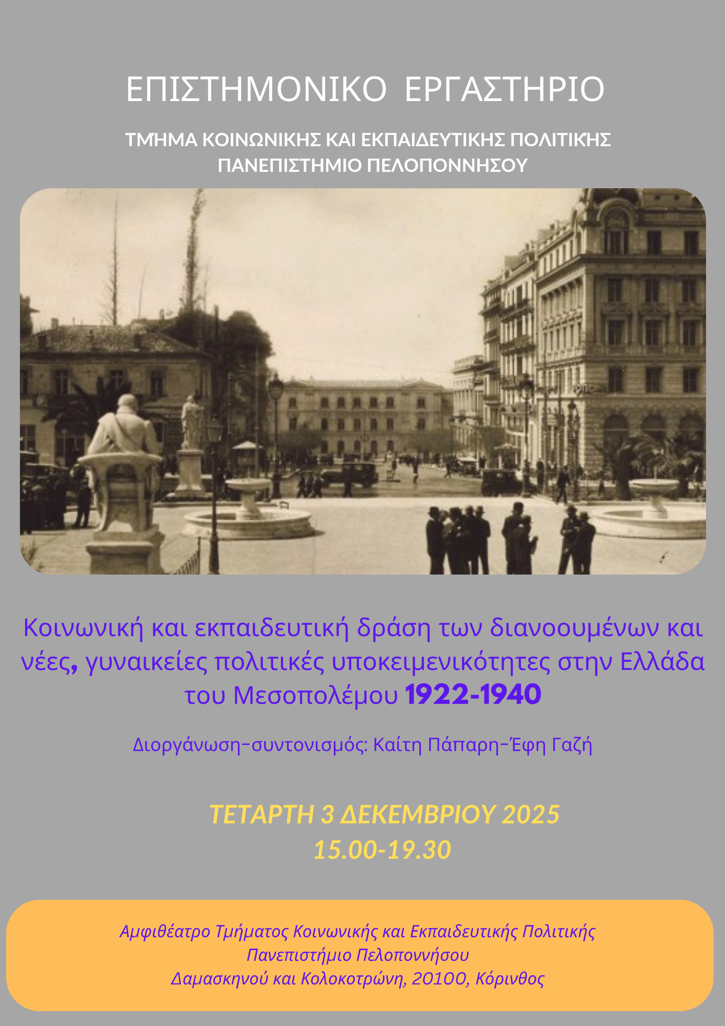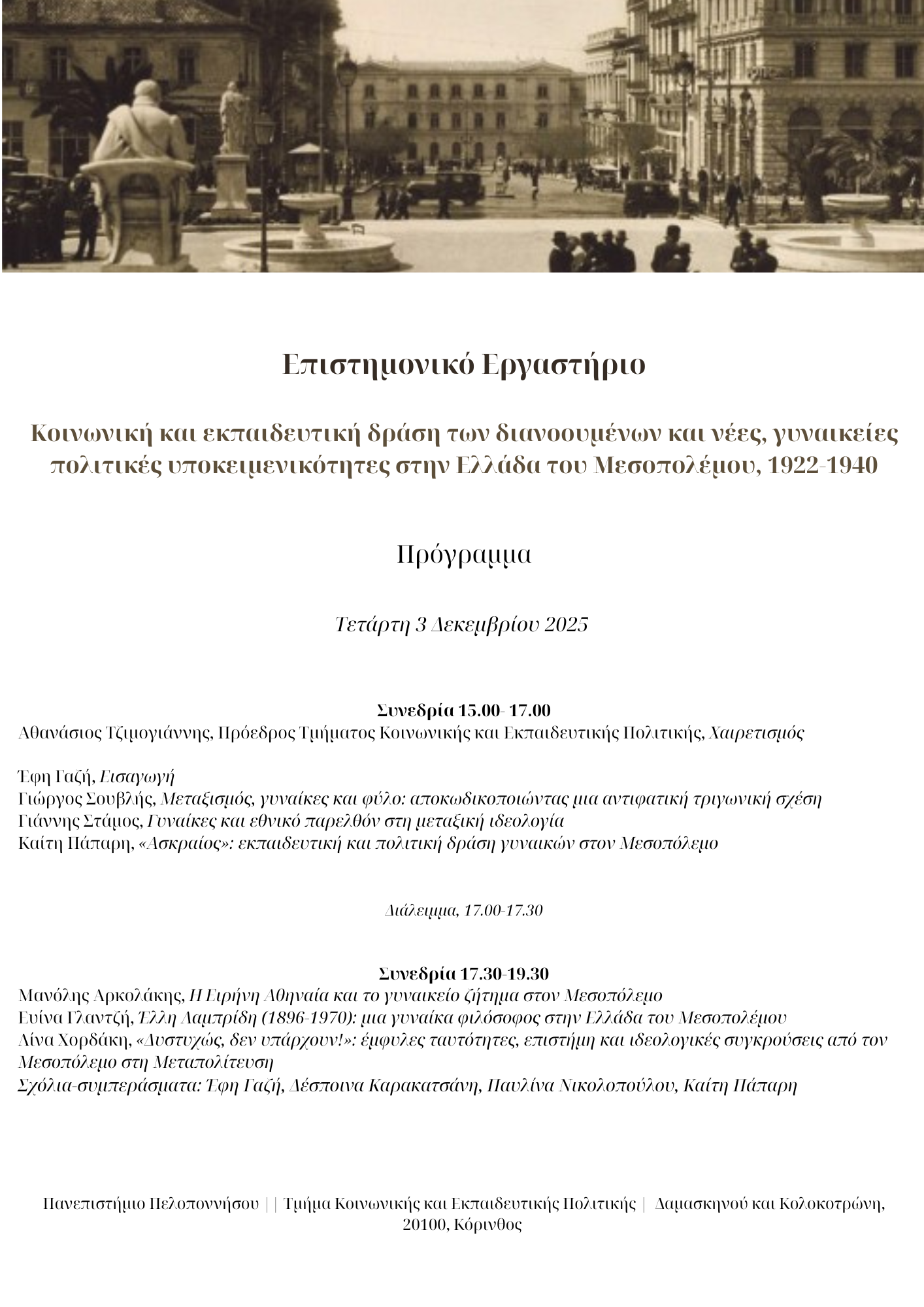 Επιστημονικό Εργαστήριο με θέμα "Κοινωνική και εκπαιδευτική δράση των διανοουμένων και νέες, γυναικείες πολιτικές υποκειμενικότητες στην Ελλάδα του Μεσοπολέμου, 1922-1940"